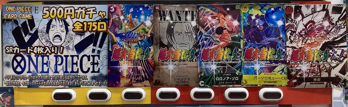 【ワンピースカード販売情報】 ワンピ5⃣0️⃣0️⃣円ガチャ、リニューアルしました!! 全1️⃣7️⃣5⃣口 ハズレはSR4枚入り💡⠜ 超大当たりはウソ八SP、手配書シャンクス、 ゾロ リーダーパラレルなど🤩✨ ぜひご挑戦ください!! 明日もご来店お待ちしております♪̊̈♪̆̈
