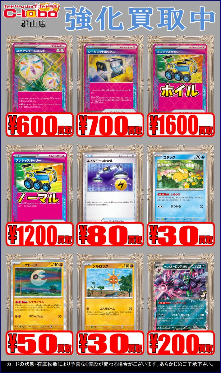 【ポケカ買取情報】 ネオアッパーエネルギー【ACE】{071/071} ¥600買取 シークレットボックス【ACE】{092/101} ¥700買取 ポケパッド【-】{015/023} ¥100買取 POPカード買取募集中です🔥 ポケカ買取はカードラボ郡山店まで!!! 皆様のお持ち込みお待ちしております🙇♂️