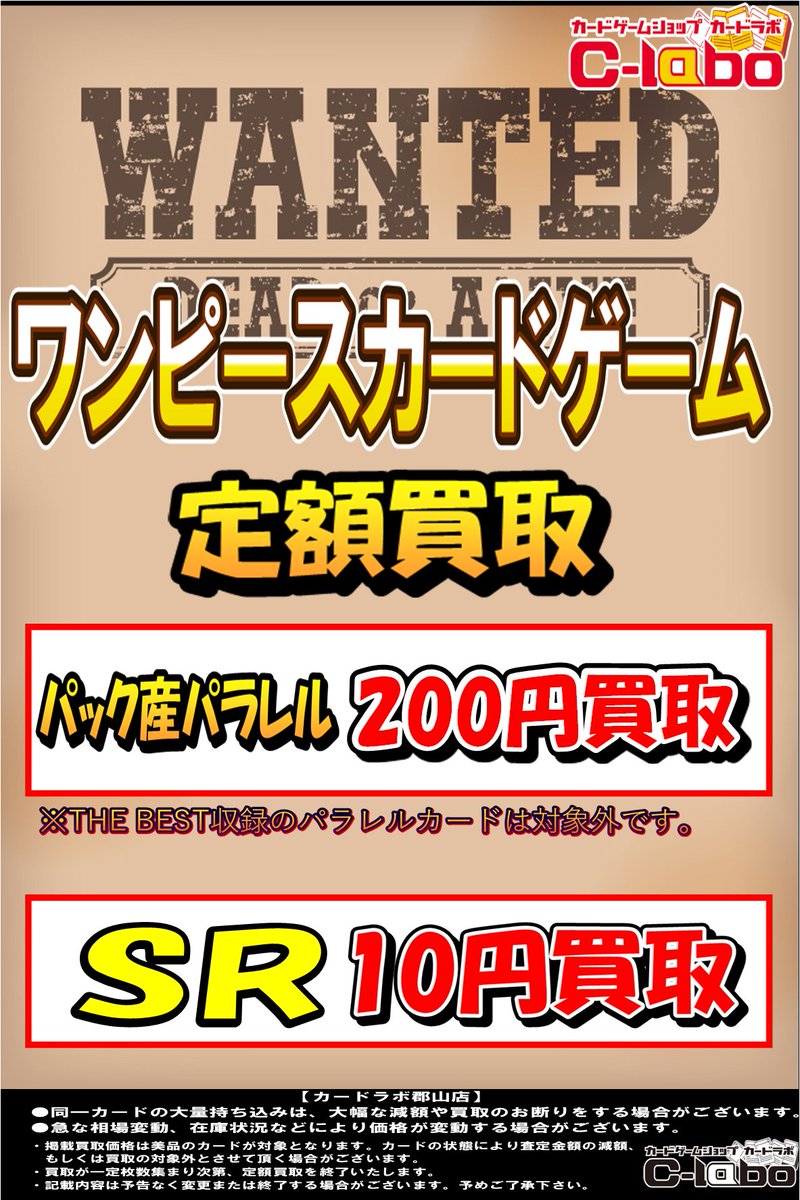 【ワンピースカード買取情報】 本日よりワンピースカードの定額が変更になります。 パラレル定額 300円→200円 SR定額 20円→10円 よろしくお願いします。 ※美品での買取価格となりますのであらかじめご了承ください。