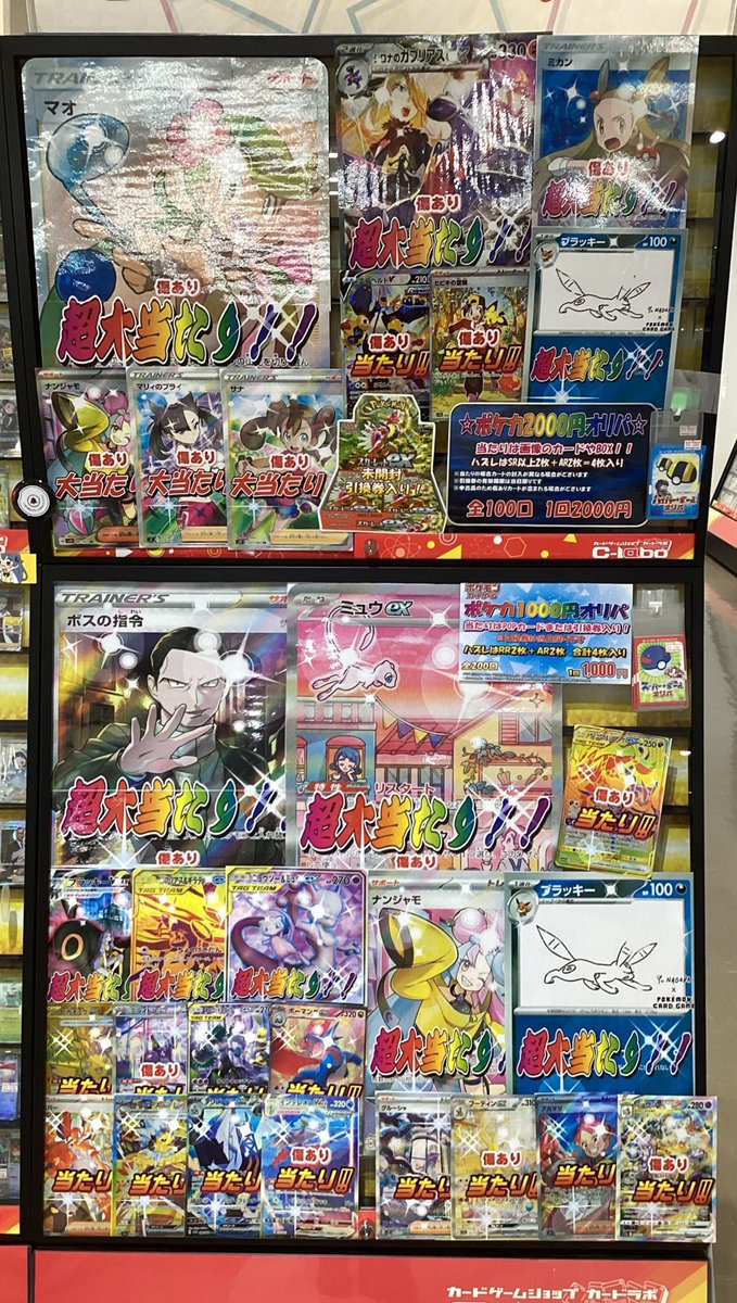 【オリパ 販売情報】 🌟ポケカ2000円オリパ🌟 大当たりは『マオ』✨ 🌟ポケカ1000円オリパ🌟 大当たりは『ボスの指令』『ミュウex』 他にも画像のカードが当たります!! ご挑戦お待ちしております🎉