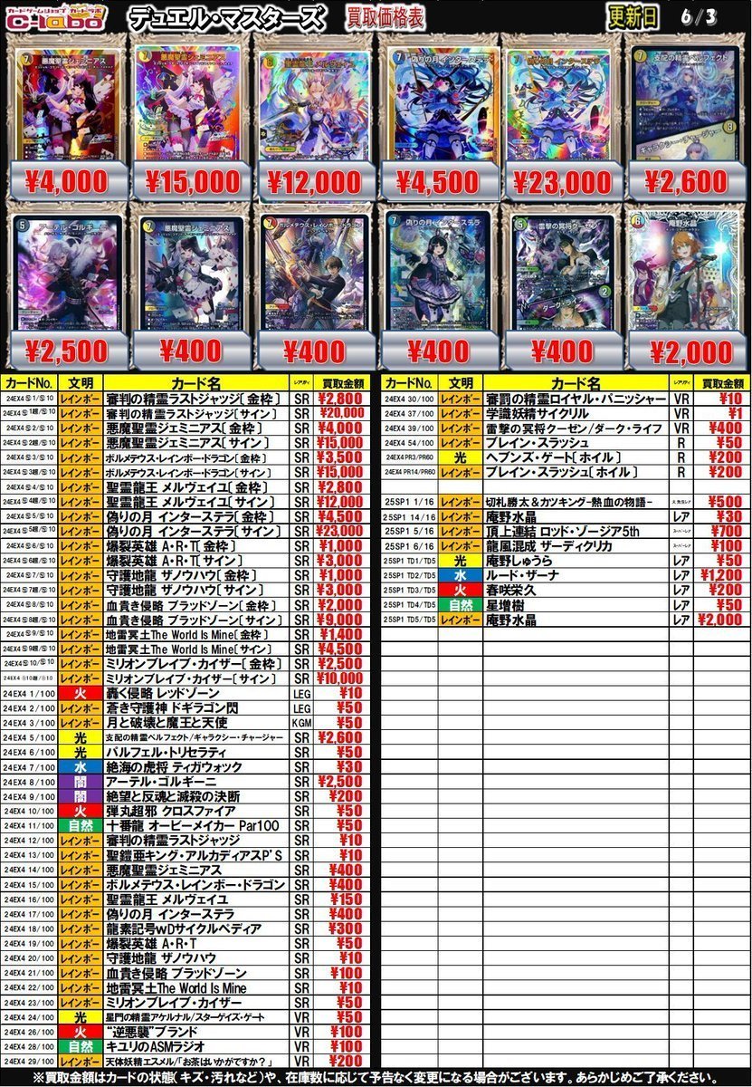 【デュエマ 買取情報】 審判の精霊ラストジャッジ〔金枠〕 2800円買取 悪魔聖霊ジェミニアス〔サイン〕 15000円買取 絶望と反魂と滅殺の決断24EX4 9/100 200円買取 などなど 庵野水晶 25SP1TD5/TD5 2000円買取 是非お持ち込みお待ちしております🔥