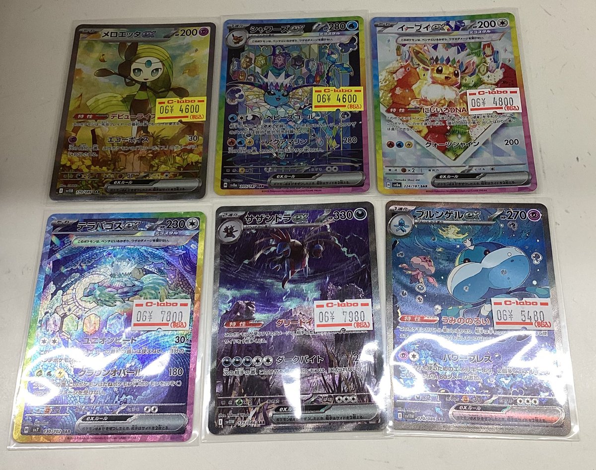 【ポケモンカード 販売情報】 画像のカードが入荷いたしました🩵 ・メロエッタex SAR 特価✨️ ・シャワーズex SAR 特価✨️ ・イーブイex SAR ・テラパゴスex SAR ・サザンドラex SAR ・ブルンゲルex SAR ご来店お待ちしております🍀.⋆