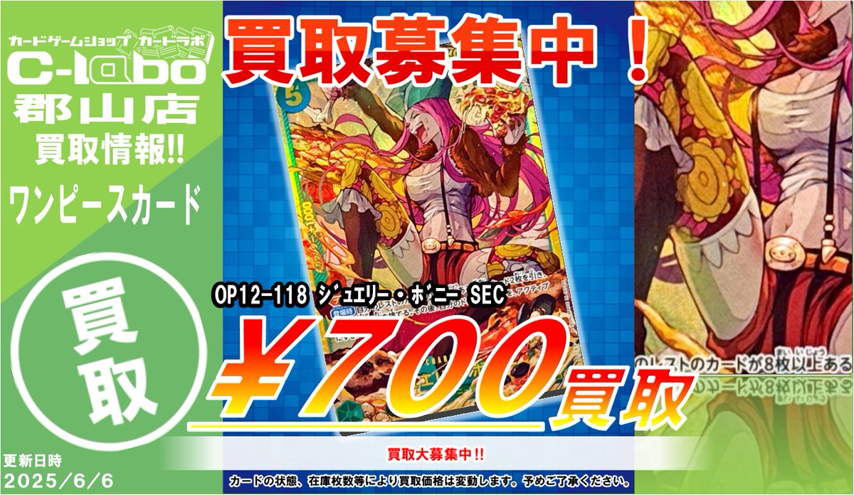 【ワンピースカード買取情報】 🍖OP12‐118 ジュエリー・ボニー SEC ¥700買取🍖 🍖OP12‐118 ジュエリー・ボニー SEC ¥700買取🍖 🍖OP12‐118 ジュエリー・ボニー SEC ¥700買取🍖 ぜひお持ち込みくださいませ!! 明日もご来店お待ちしております!!