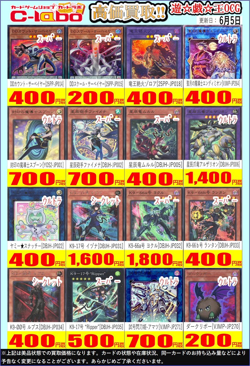 【査定についてのお知らせ】 カードラボ郡山店をご利用いただきありがとうございます。 6/9(月)より買取に出していただく際に、 同名カード毎にソートしていただくようお願いします。 ソートされていない場合スピード査定に切り替えさせていただきます。 スムーズなご案内にご協力をお願いいたします