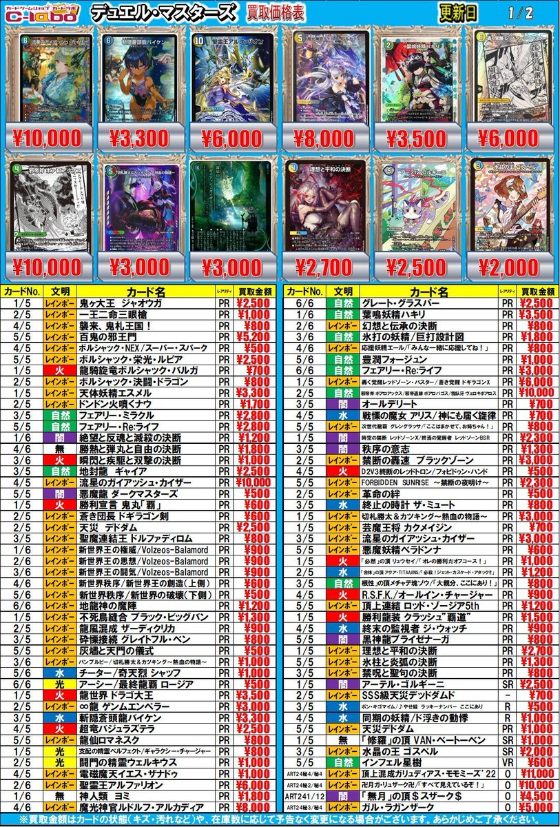 【デュエマ 買取情報】 神アートの買取表になります 本日の買取受付11時から開始です 是非お持ち込みお待ちしております❣