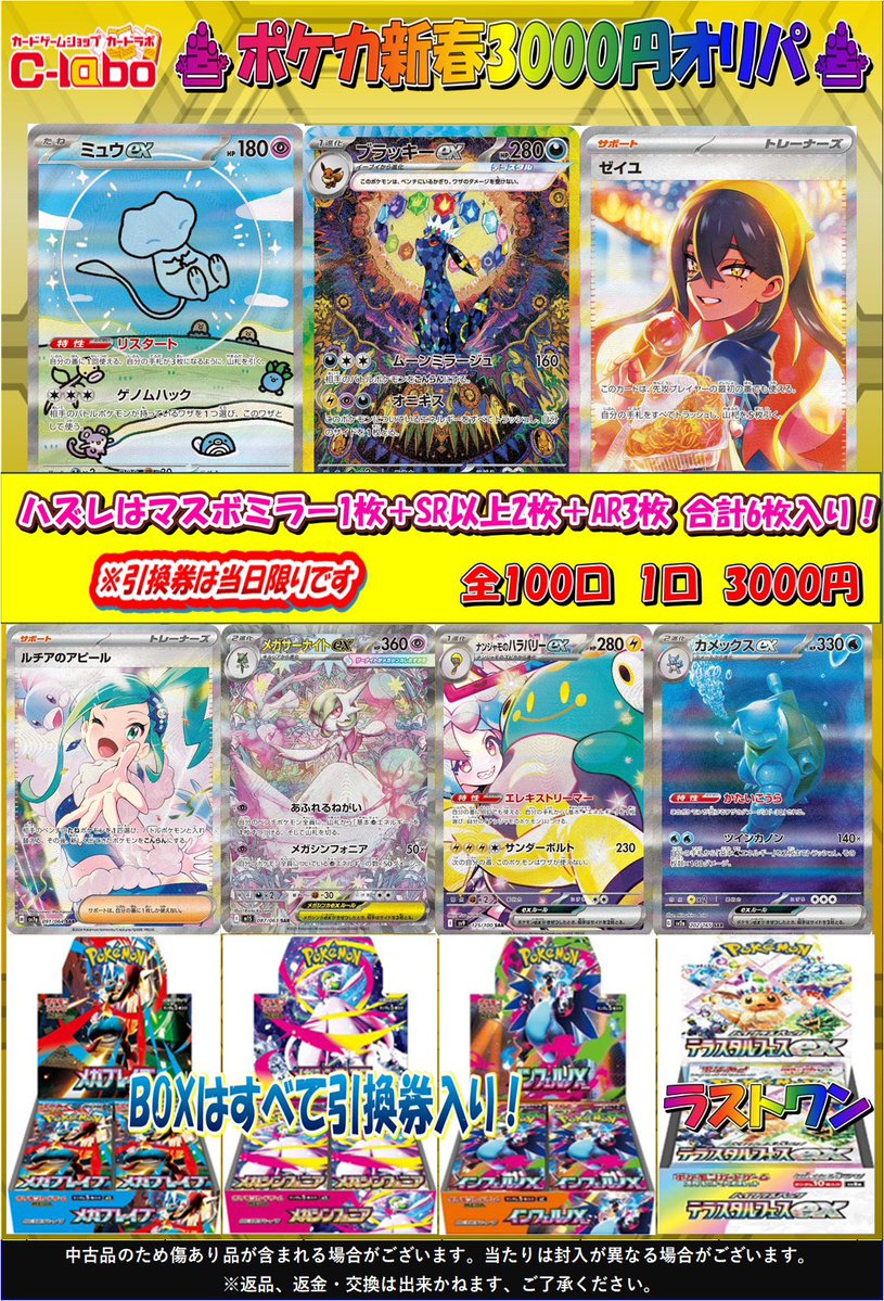 【ポケカ販売情報】 1月2日より 『ポケカ新春3000円オリパ』販売いたします🙌 ミュウexとブラッキーexのSARが大当たり‼️ その他BOXやPOP掲載のカードが当たりとなっております😊 2026年も皆様のご来店お待ちしております🤗
