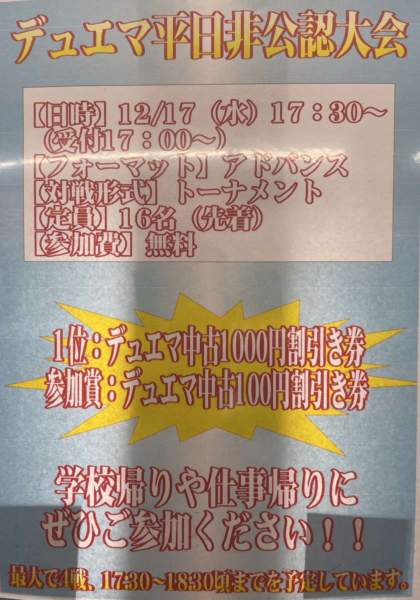 本日17:30からいつもの!デュエマ非公認やります! 今回はアドバンスで開催させていただきますよ〜(*´ω`*)