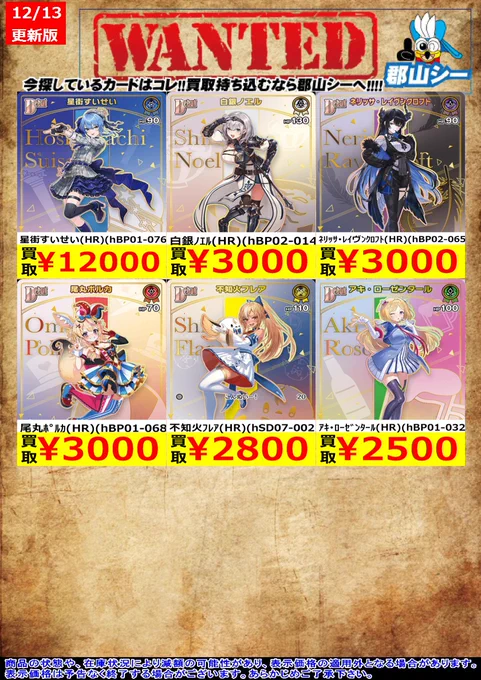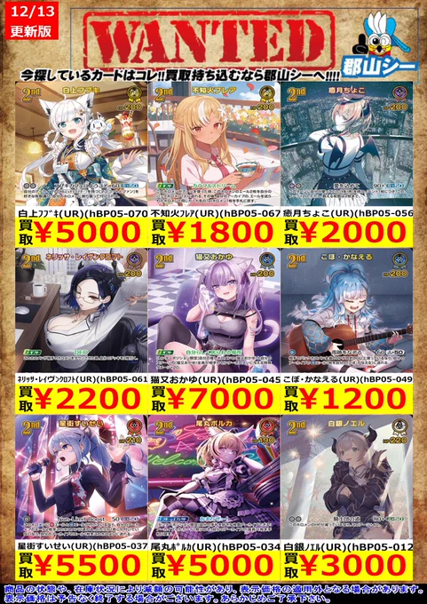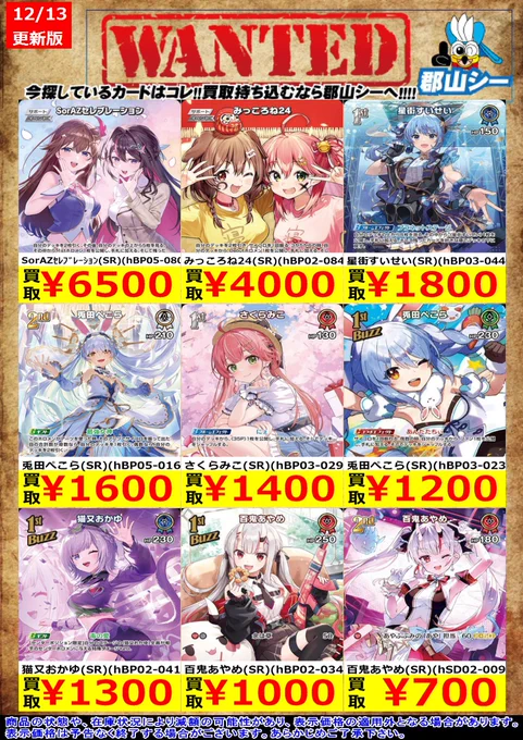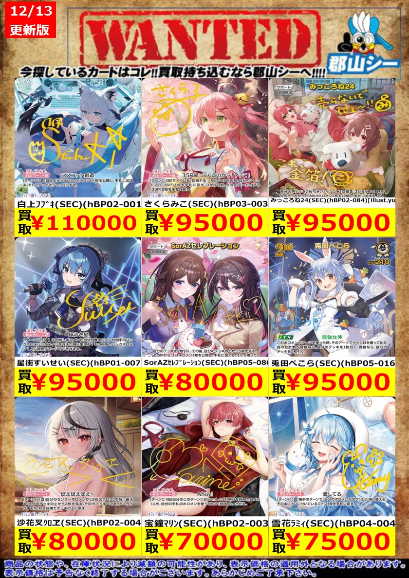シーガル郡山店ホロライブOCGお買取り情報!! ※商品の状態や在庫状況により減額の可能性があり、表示価格の適用外となる場合がございます。 博衣こより(P)(hBP04-013)¥1,300 さくらみこ(P)(hBP03-030) ¥2,000 白上フブキ(P)(hBP02-013)¥2,000