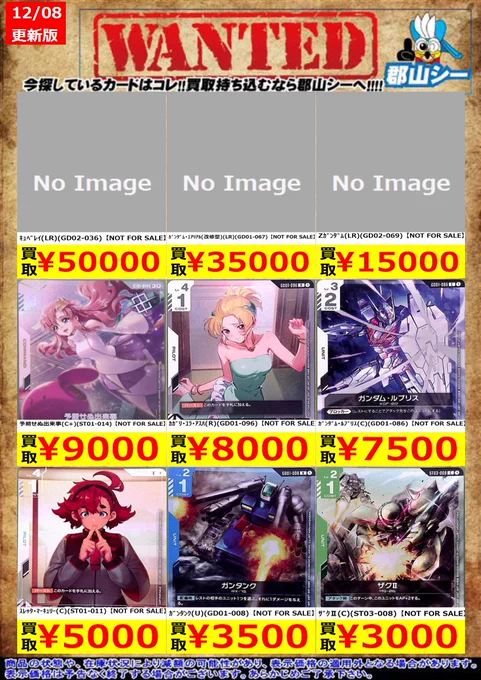 シーガル郡山店ガンダムCGお買取情報!! Zガンダム(LR)(GD02-069)【NOT FOR SALE】 ¥15,000 ガンダム・エアリアル(改修型)(LR)(GD01-067)【NOT FOR SALE】 ¥35,000 キュベレイ(LR)(GD02-036)【NOT FOR SALE】 ¥50,000