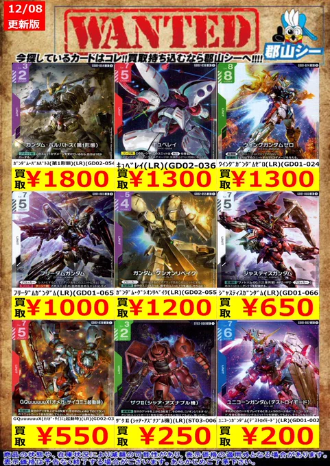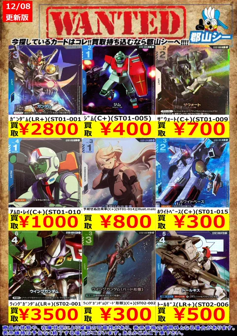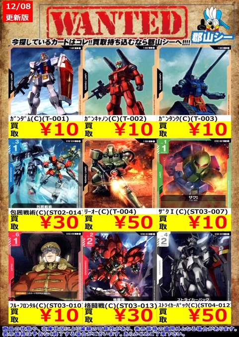 シーガル郡山店ガンダムCGお買取情報!! アーガマ(R)(GD02-129) ¥10 シェンロンガンダム(R)(GD01-029) ¥30 フォビドゥンガンダム(R)(GD02-006) ¥30
