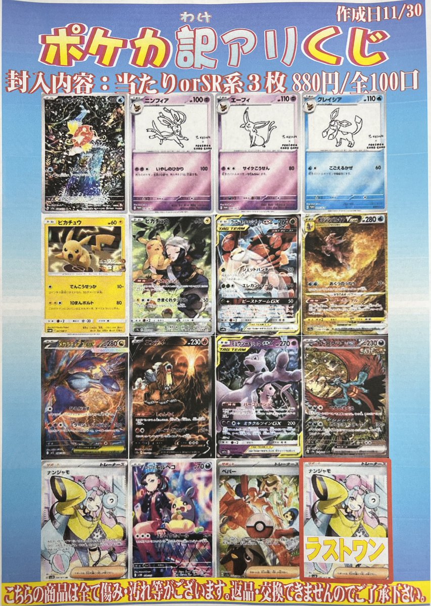 🌈ポケカ訳ありくじ🌈 880円 全100口 展開致しました‼️ コイキングARやNAGABAブイズ等が当たります🎯💕 ハズレでもSR系3枚確定! ラストワンはナンジャモSR🩷 是非ぜひ摘んでみてくださいね(*´ω`*) ※本商品の排出カードは原則傷み・汚れがございます🩹