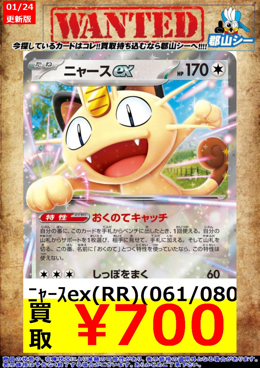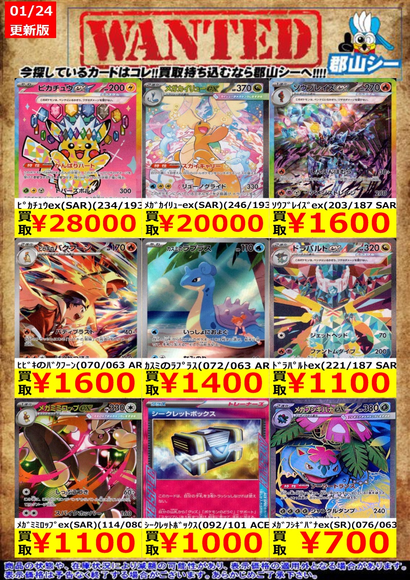 シーガル郡山店ポケカ数量限定お買取り情報更新です!よろしくお願いいたします! ※商品の状態や在庫状況により減額の可能性があり、表示価格の適用外となる場合がございます。 メガスターミーex(RR)(021/080) ¥200 ロック闘エネルギー(R)(080/080) ¥300