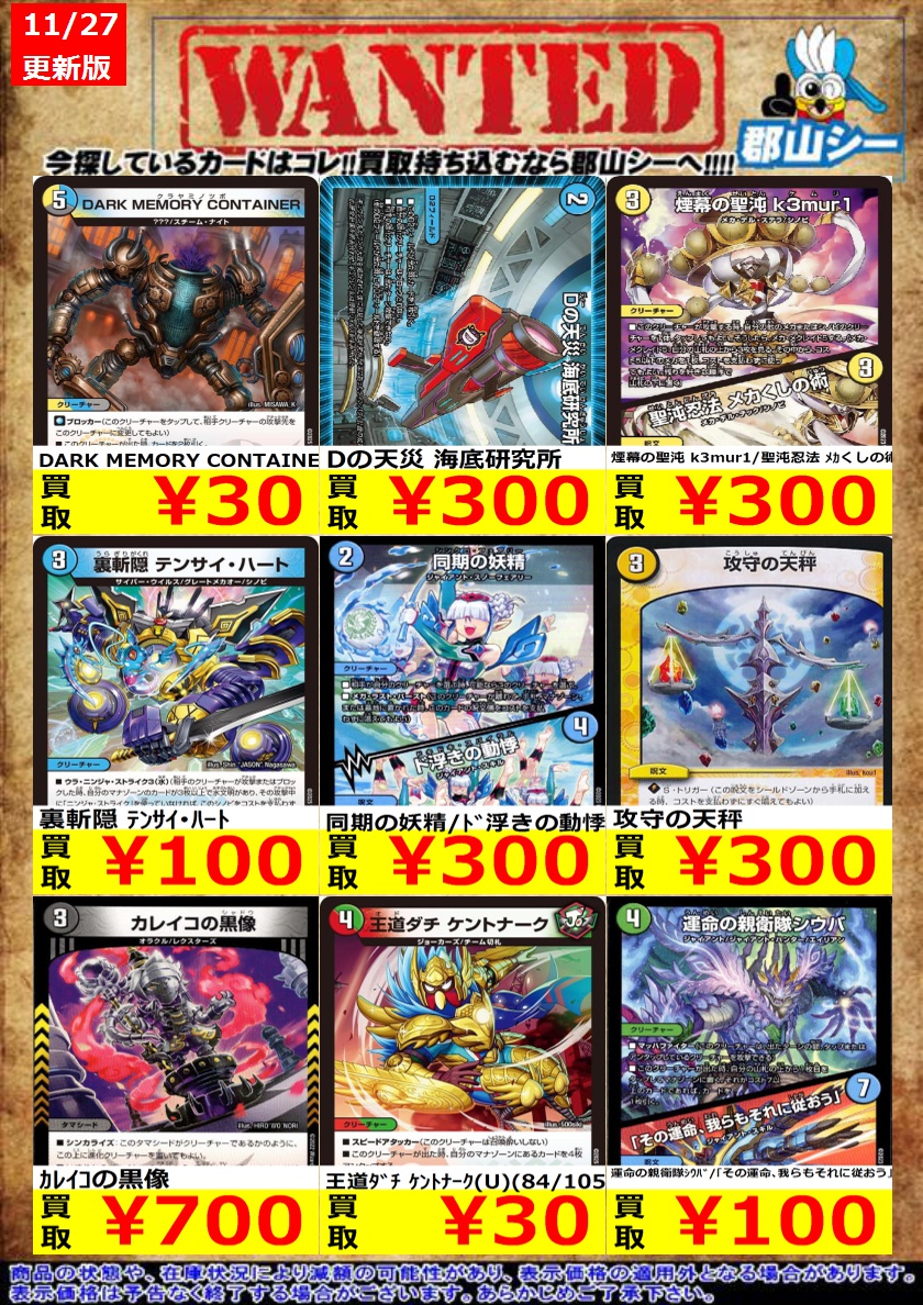 シーガル郡山店デュエマノーマルお買取り情報!! ※商品の状態や在庫状況により減額の可能性があり、表示価格の適用外となる場合がございます。 DARK MEMORY CONTAINER ¥30 裏斬隠 テンサイ・ハート ¥100 煙幕の聖沌 k3mur1/聖沌忍法 メカくしの術 ¥300