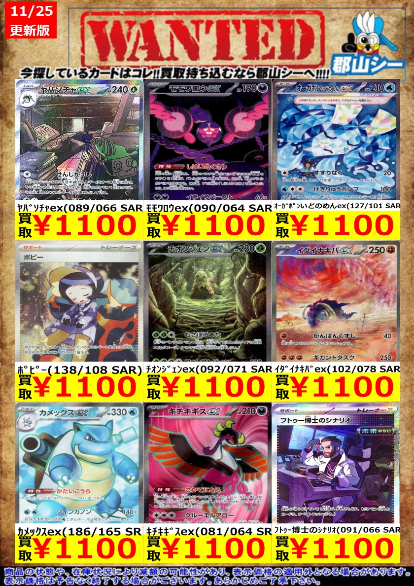 シーガル郡山店ポケカ数量限定お買取り情報更新です!よろしくお願いいたします! ※商品の状態や在庫状況により減額の可能性があり、表示価格の適用外となる場合がございます。 ミュウex(195/165 SR) ¥1,300 ミミッキュ(341/190 AR) ¥1,500 ペパー(353/190 SAR) ¥1,500