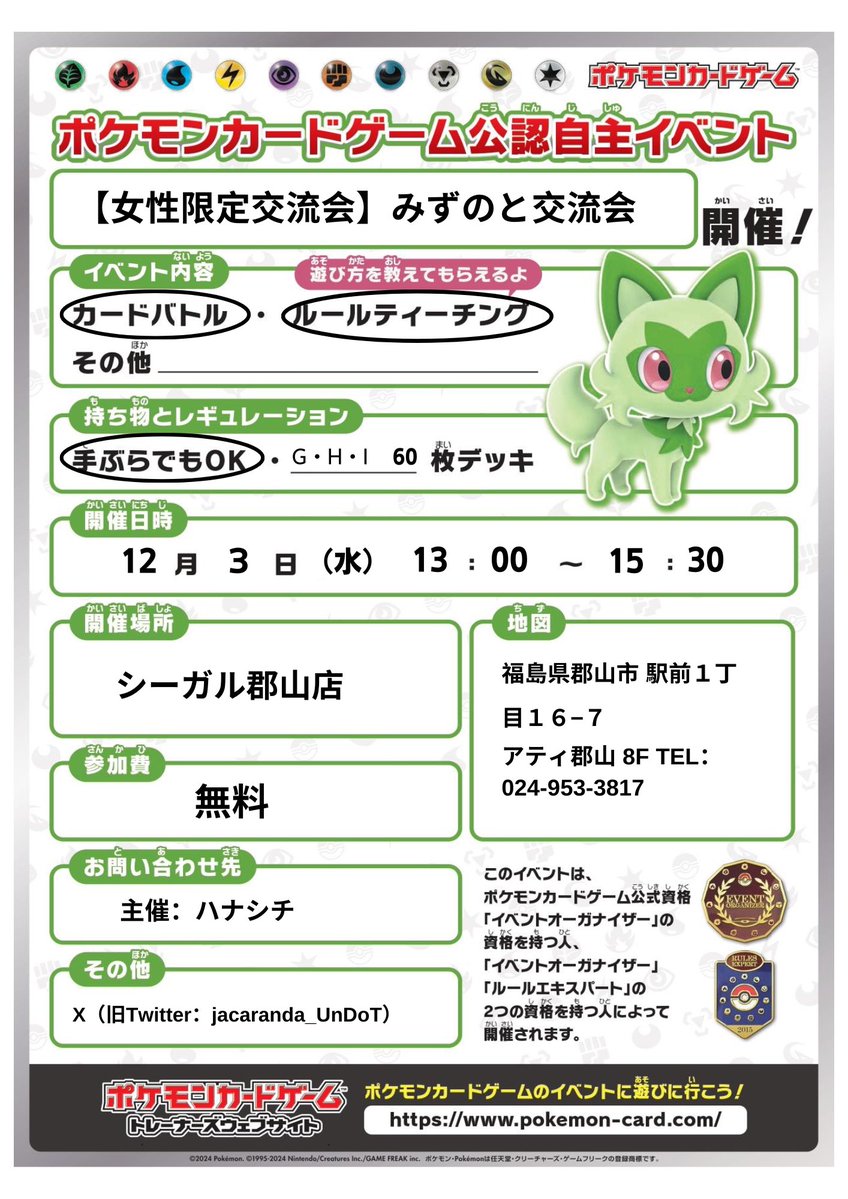 シーガル郡山店です! ポケモンカードイベントのお知らせです- ̗̀📣 12月3日(水)13:00~当日受付 女性限定対戦交流会 みずのと交流会 を開催します! 初めての方🔰でも大歓迎!! 貸し出しデッキでも対戦できます! お友達や推しグッズと一緒に遊びにきませんか?お待ちしております😊✨