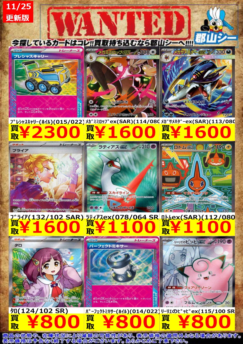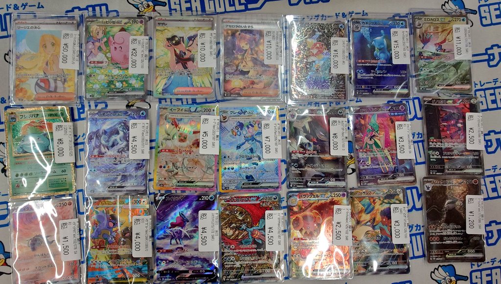 シーガル郡山店ポケカ数量限定お買取り情報更新です!よろしくお願いいたします! ※商品の状態や在庫状況により減額の可能性があり、表示価格の適用外となる場合がございます。 メガサメハダーex(SAR)(113/080) ¥1,600 メガミミロップex(SAR)(114/080) ¥1,600 ヒカリ(SAR)(115/080) ¥4,300