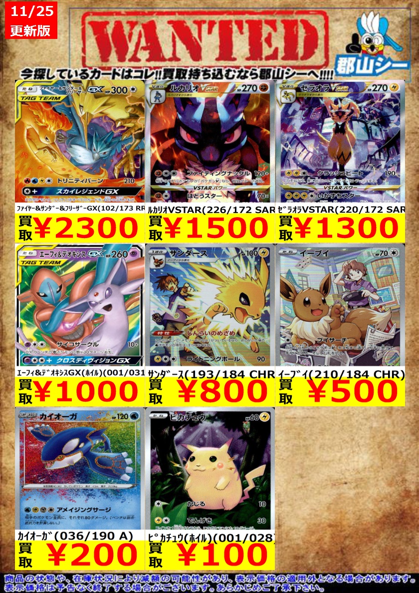 シーガル郡山店ポケカ数量限定お買取り情報更新です!よろしくお願いいたします! ※商品の状態や在庫状況により減額の可能性があり、表示価格の適用外となる場合がございます。 ピカチュウ(ホイル)(001/028) ¥100 カイオーガ(036/190 A) ¥200 サンダース(193/184 CHR) ¥800