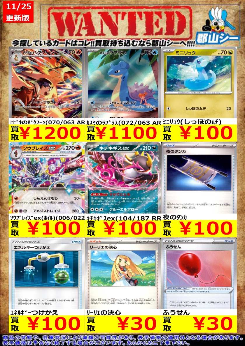 シーガル郡山店ポケカ数量限定お買取り情報更新です!よろしくお願いいたします! ※商品の状態や在庫状況により減額の可能性があり、表示価格の適用外となる場合がございます。 リーリエの決心 ¥30 夜のタンカ ¥100 キチキギスex(104/187 RR) ¥100