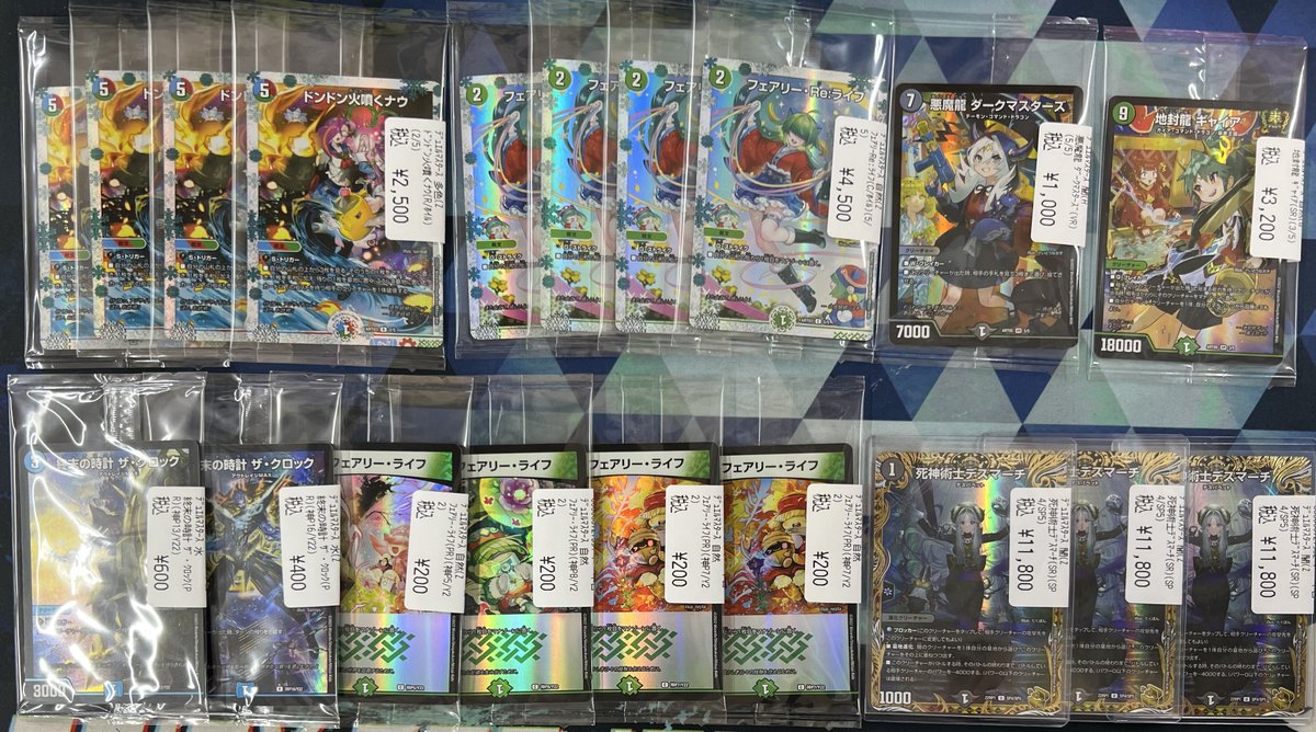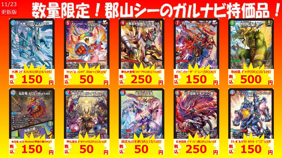 数量限定!郡山シー限定ガルナビ特価品 超次元の王家(SR)(15/105) ¥50 洗打の妖精(U)(34/77) ¥100 ~地獄帰りの騎士~(R)(22/77) ¥100 #デュエマ #シーガル郡山 #アツアツ特価