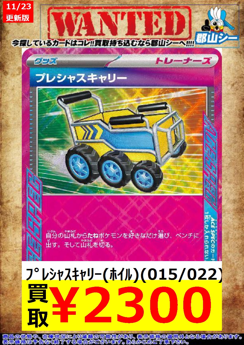 シーガル郡山店ポケカ数量限定お買取り情報更新です!よろしくお願いいたします! ※商品の状態や在庫状況により減額の可能性があり、表示価格の適用外となる場合がございます。 プレシャスキャリー(ホイル)(015/022) ¥2,300 パーフェクトミキサー(ホイル)(014/022) ¥800