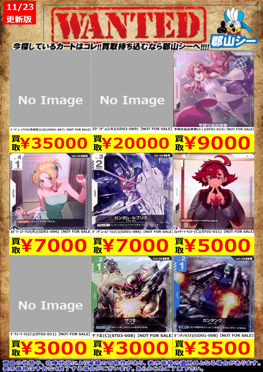 シーガル郡山店ガンダムCGお買取情報!! Zガンダム(LR)(GD02-069)【NOT FOR SALE】 ¥20,000 ガンダム・エアリアル(改修型)(LR)(GD01-067)【NOT FOR SALE】 ¥35,000 溢れる慈愛(U)(GD01-118)【NOT FOR SALE】 ¥1,100
