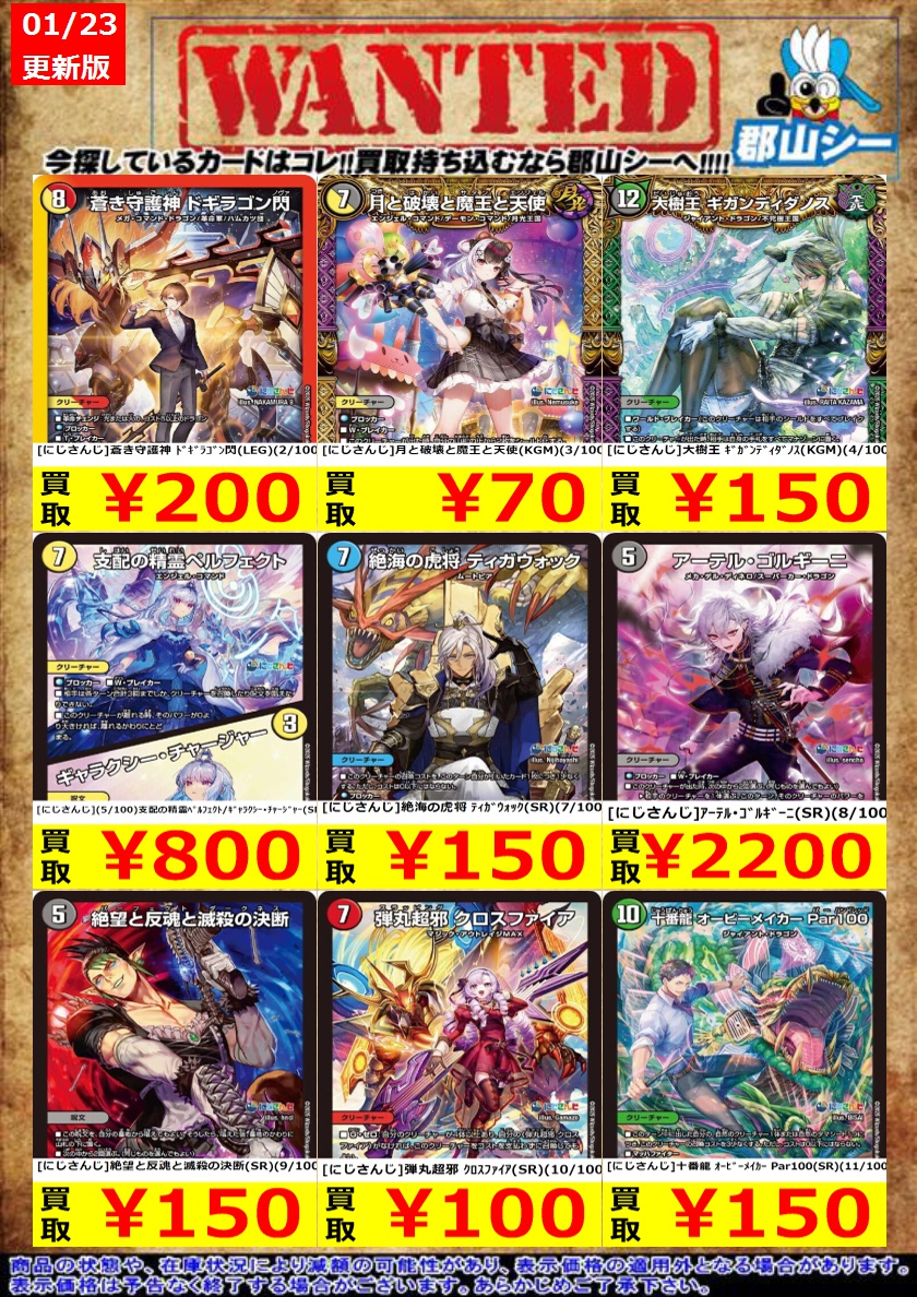 シーガル郡山店デュエマお買取り情報!! ※商品の状態や在庫状況により減額の可能性があり、表示価格の適用外となる場合がございます。 [にじさんじ]勇気のリュウセイ・ブレイブ(VR)(40/100) ¥50 [にじさんじ]ブレイン・スラッシュ(R)(54/100) ¥200