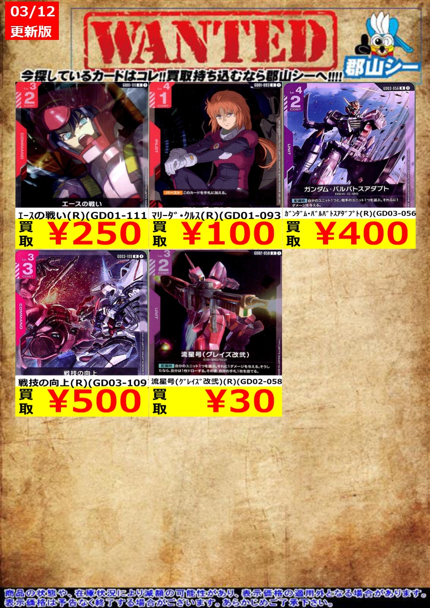 シーガル郡山店ガンダムCGお買取情報!! エースの戦い(R)(GD01-111) ¥250 ガンダム・バルバトスアダプト(R)(GD03-056) ¥400 戦技の向上(R)(GD03-109) ¥500