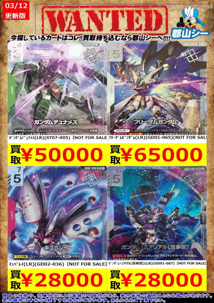 シーガル郡山店ガンダムCGお買取情報!! カミーユ・ビダン(R)(GD02-097)【NOT FOR SALE】 ¥1,000 ロックオン・ストラトス(ニール)(C)(ST07-011)【NOT FOR SALE】 ¥6,500 ガンダムデュナメス(LR)(ST07-005)【NOT FOR SALE】 ¥50,000