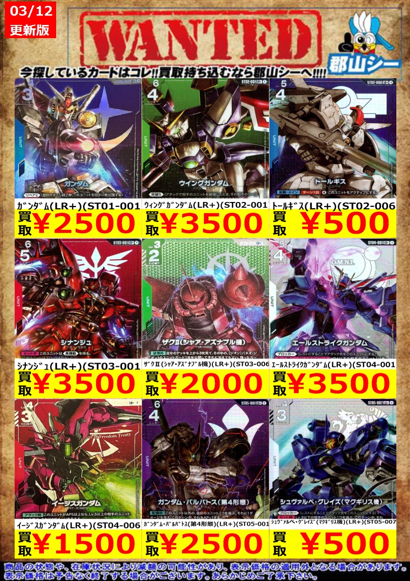 シーガル郡山店ガンダムCGお買取情報!! 鉄と血と(SP)(C+)(ST05-013) ¥100 Ζガンダム(バイオセンサー起動時)(R+)(GD03-071) ¥300 グラハム・エーカー(R+)(GD03-098) ¥600