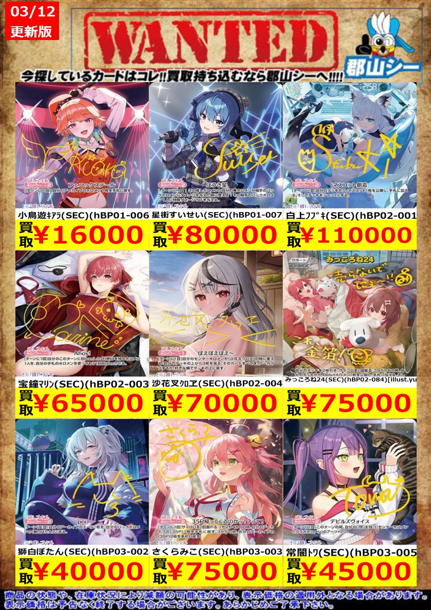 シーガル郡山店ホロライブOCGお買取り情報!! ※商品の状態や在庫状況により減額の可能性があり、表示価格の適用外となる場合がございます。 アイラニ・イオフィフティーン(SEC)(hBP05-002) ¥15,000 ラプラス・ダークネス(SEC)(hBP04-005) ¥35,000 角巻わため(SEC)(hBP03-007) ¥50,000