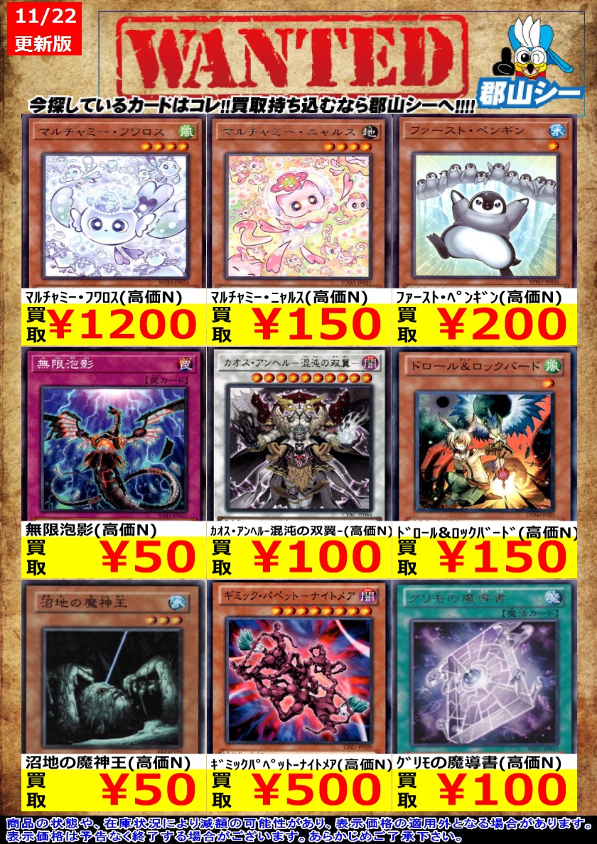 シーガル郡山店遊戯王お買取り情報 ※商品の状態や在庫状況により減額の可能性があり、表示価格の適用外となる場合がございます。 無限泡影(高価N) ¥50 マルチャミー・ニャルス(高価N) ¥150 ファースト・ペンギン(高価N) ¥200 #遊戯王 #シーガル #郡山店