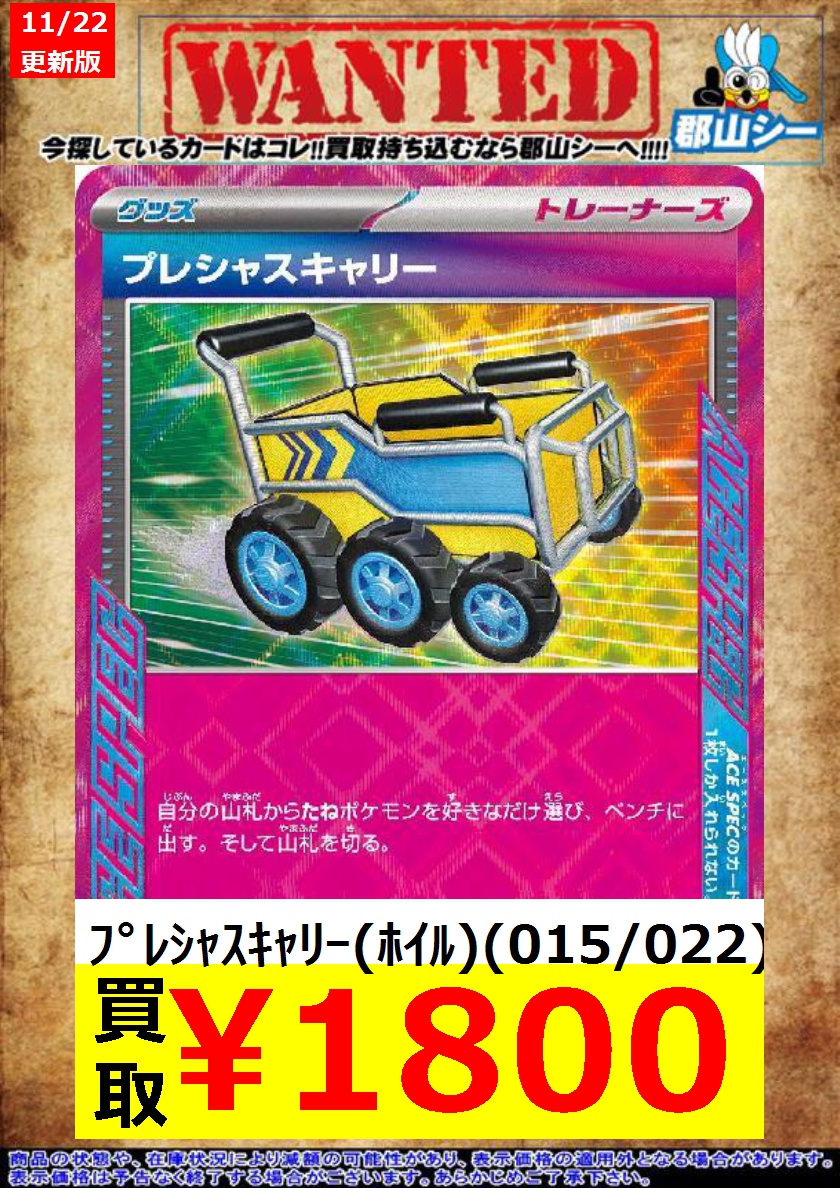 シーガル郡山店ポケカ数量限定お買取り情報更新です!よろしくお願いいたします! ※商品の状態や在庫状況により減額の可能性があり、表示価格の適用外となる場合がございます。 プレシャスキャリー(ホイル)(015/022) ¥1,800 パーフェクトミキサー(ホイル)(014/022) ¥400