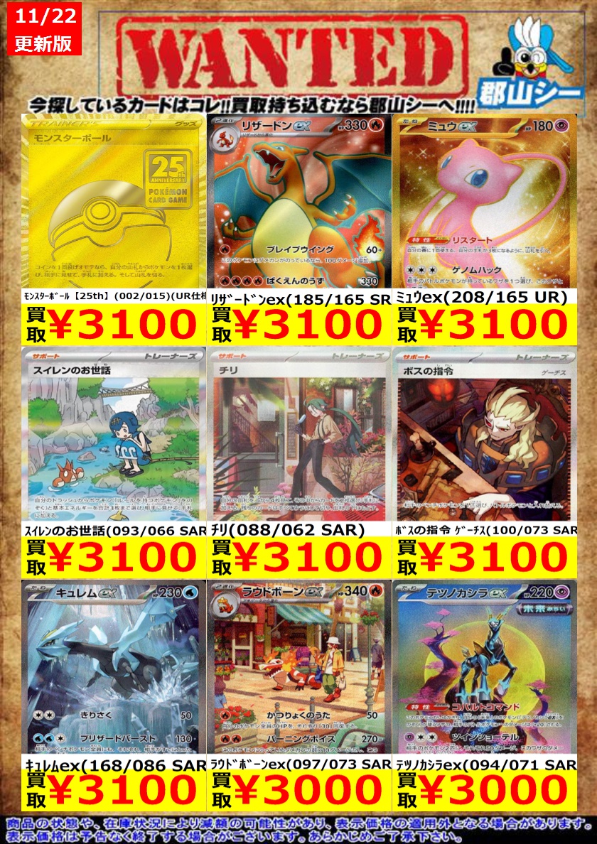 シーガル郡山店ポケカ数量限定お買取り情報更新です!よろしくお願いいたします! ※商品の状態や在庫状況により減額の可能性があり、表示価格の適用外となる場合がございます。 ロケット団のニャース(109/098 AR) ¥1,400 フシギダネ(166/165 AR) ¥1,300 ミュウex(195/165 SR) ¥1,300