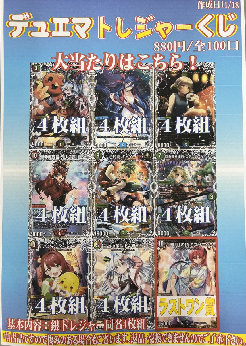 🌈デュエマトレジャーくじ🌈 ¥880 全100口 販売開始‼️ 大当たりには栄光ルピアやガイアッシュのキャラプレなど…✨️ 人気のカードが4枚組で当たっちゃいます︎💕︎︎ ラストワンはゼニスザーク金トレジャー✨️ 是非ぜひつまんでみてくださいね(*´ω`*)