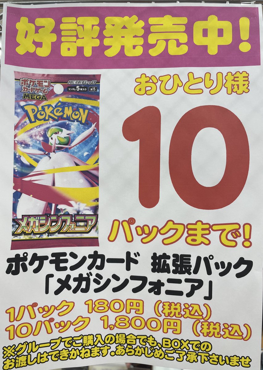 こんにちは(」・ω・) シーガル郡山店です。 ポケカ メガシンフォニア おひとり様 10パックまでご購入できます。 ※並び直しは不可能となっております。 ご来店お待ちしております(*^^*)