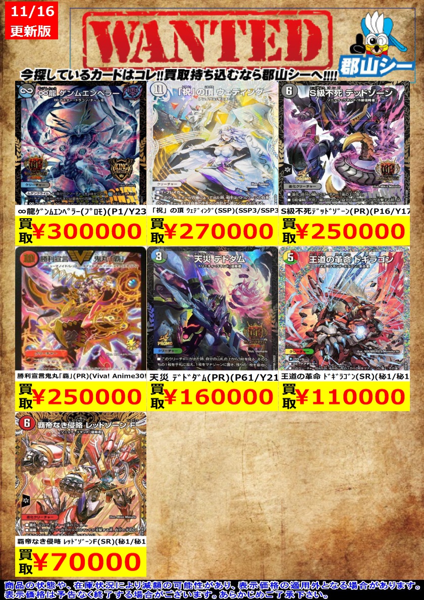 シーガル郡山店デュエマお買取り情報!! ※商品の状態や在庫状況により減額の可能性があり、表示価格の適用外となる場合がございます。 覇帝なき侵略 レッドゾーンF(SR)(秘1/秘1) ¥70,000 王道の革命 ドギラゴン(SR)(秘1/秘1) ¥110,000 S級不死デッドゾーン(PR)(P16/Y17) ¥250,000