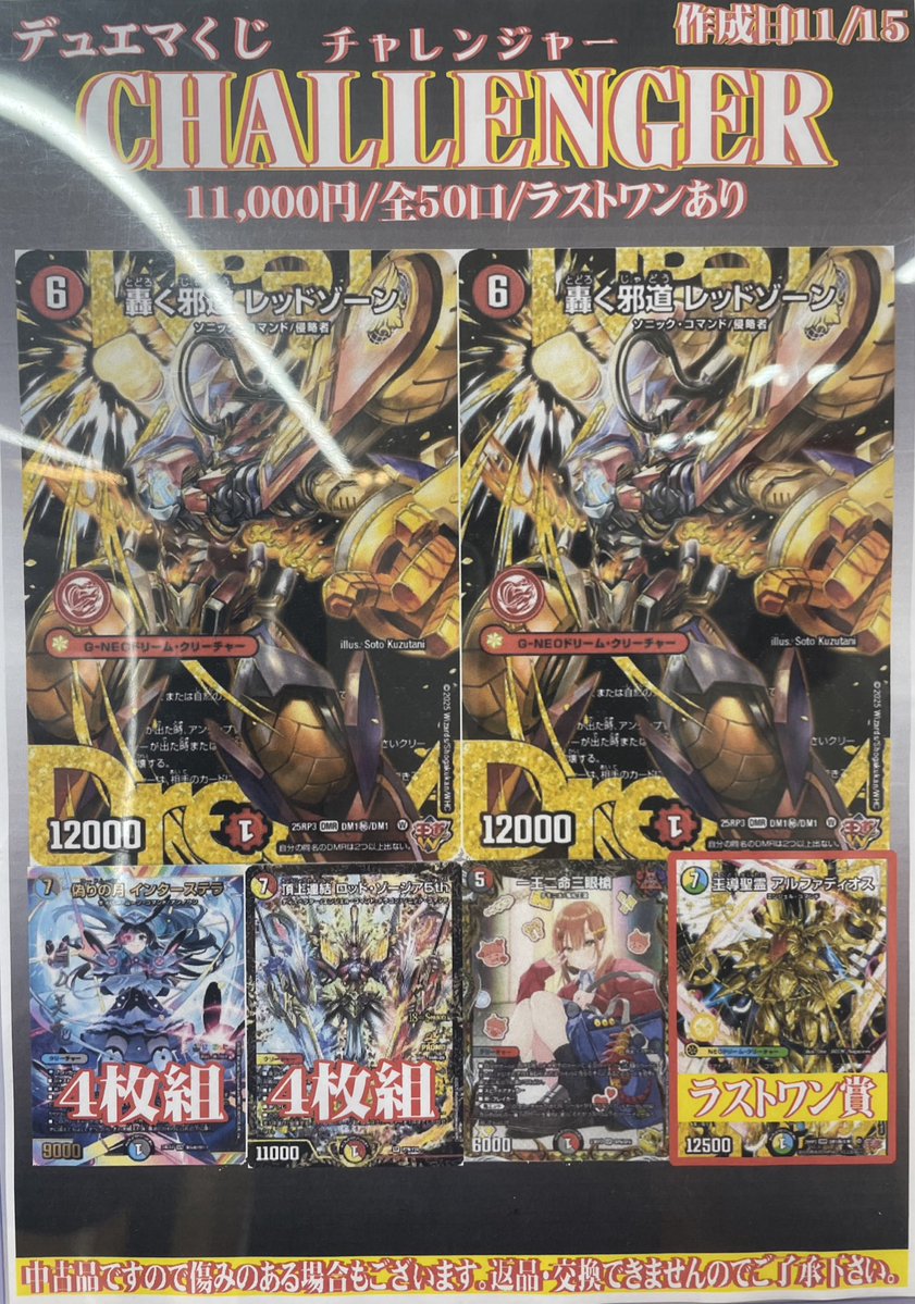 デュエマCHALLENGERくじを作成致しました❗️ 今回の大当たりは轟く邪道レッドゾーンのシークレット2口です✨ チャレンジお待ちしております🔥