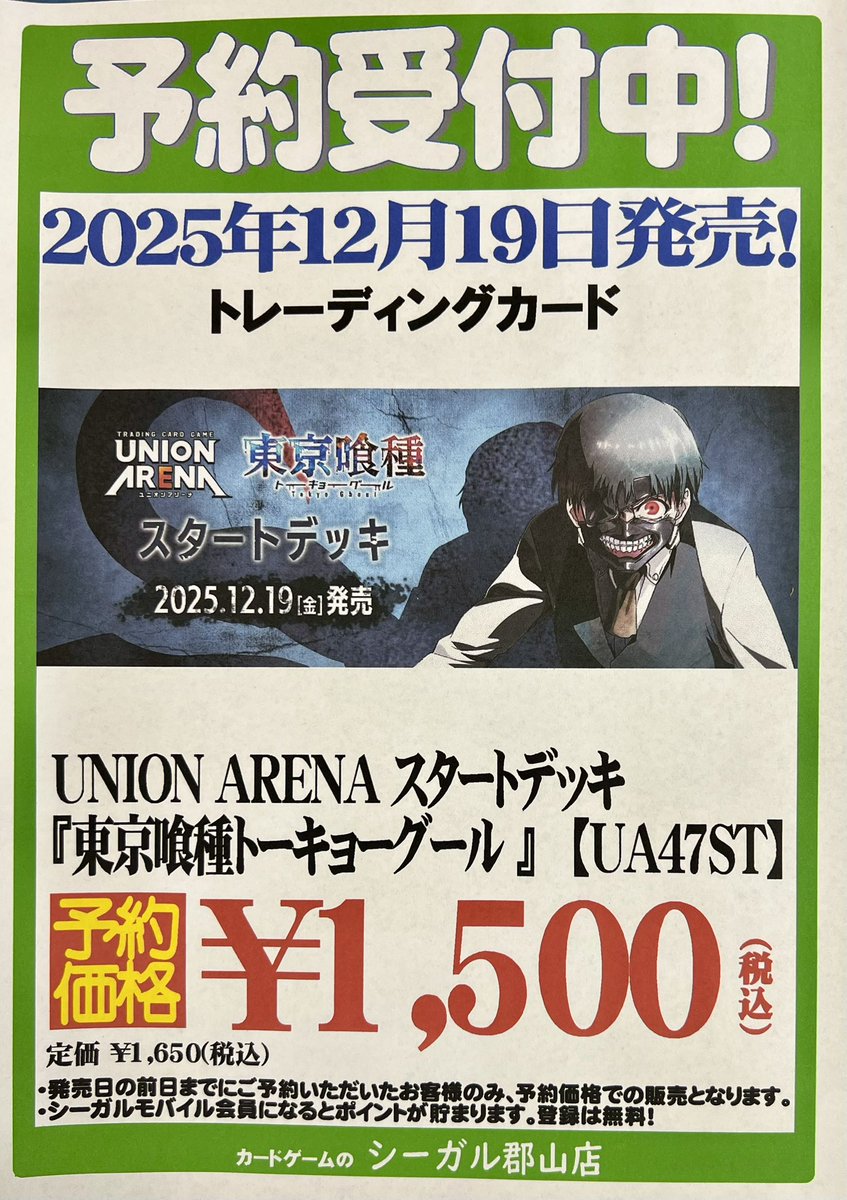【ご予約受付中】 12/19(金) 発売 #ユニオンアリーナ スタートデッキ ✅ 『東京喰種トーキョーグール』 【UA47ST】 ただいま予約受付中です❗️ ご予約お待ちしております😊 #シーガル郡山店予約