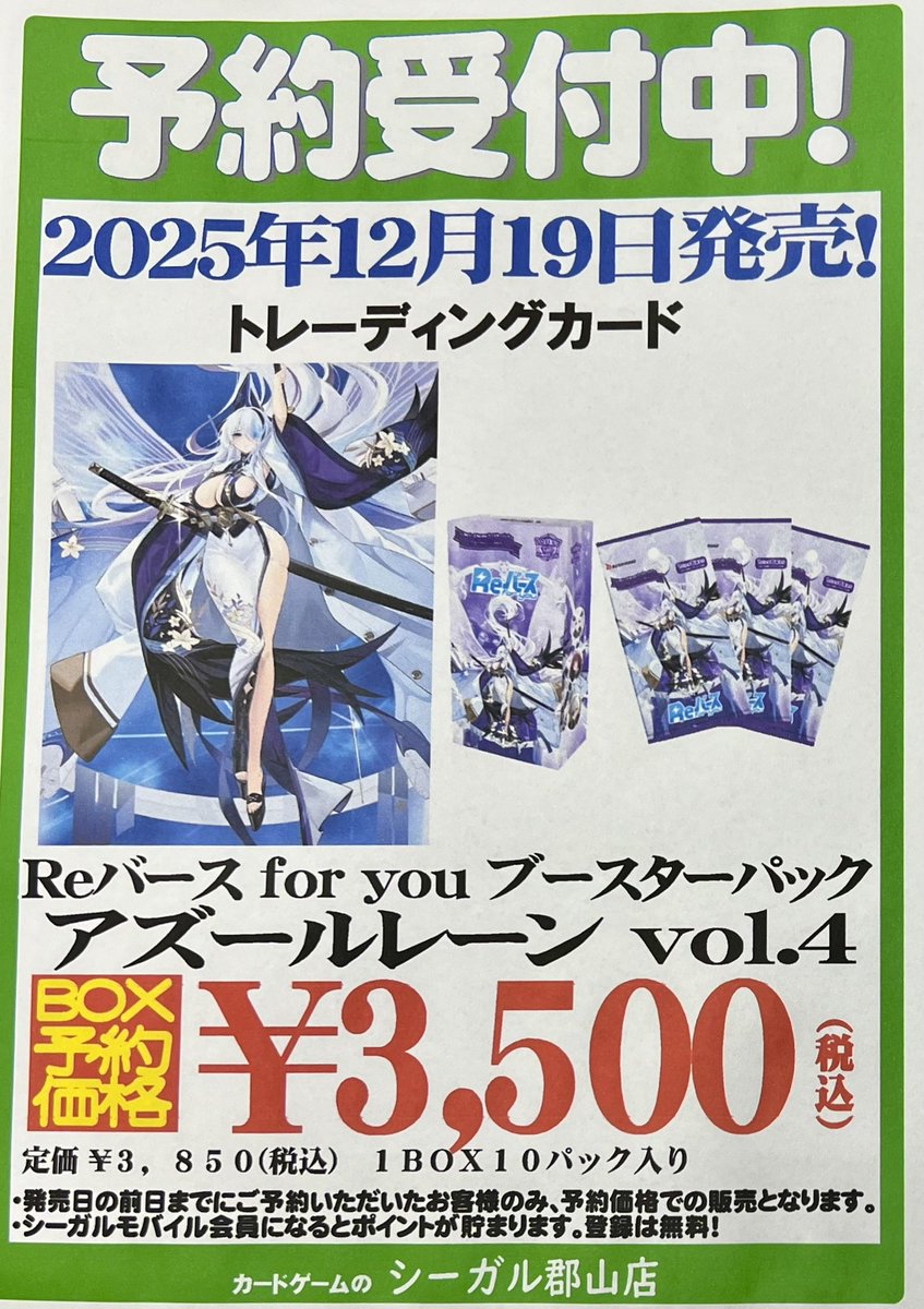 【ご予約受付中】 12/19(金) 発売 #Reバース ブースターパック 「アズールレーン vol.4」 ただいま予約受付中です❗️ ご予約お待ちしております😊 #シーガル郡山店予約