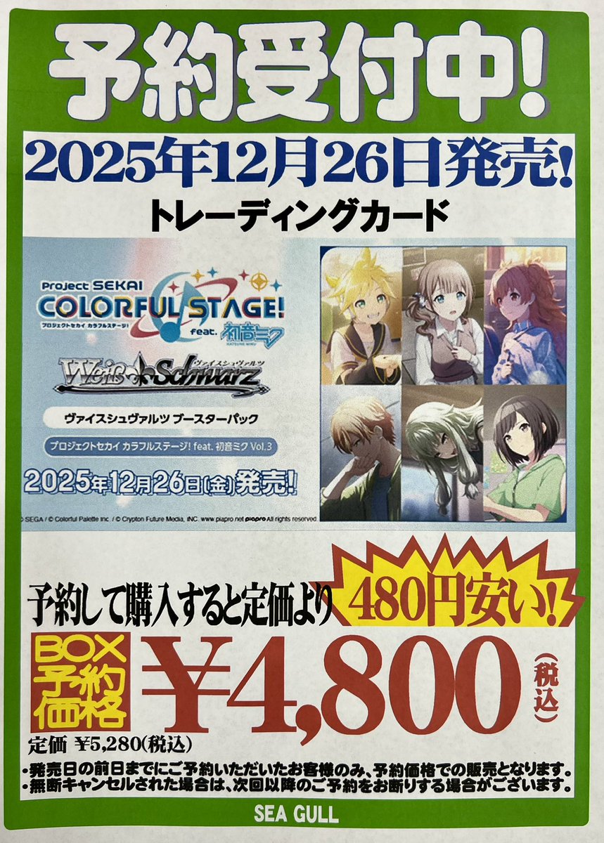 【ご予約受付中】 12/26(金) 発売 #ヴァイスシュヴァルツ ブースターパック 「プロジェクトセカイ カラフルステージ! feat. 初音ミク Vol.3」 ただいま予約受付中です❗️ ご予約お待ちしております😊 #シーガル郡山店予約