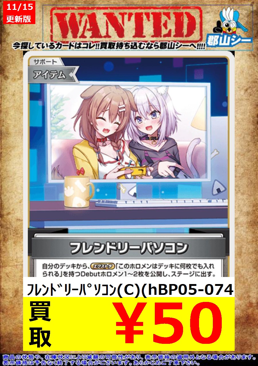 シーガル郡山店ホロライブOCGノーマルお買取り情報!! ※商品の状態や在庫状況により減額の可能性があり、表示価格の適用外となる場合がございます。 フレンドリーパソコン(C)(hBP05-074) ¥50