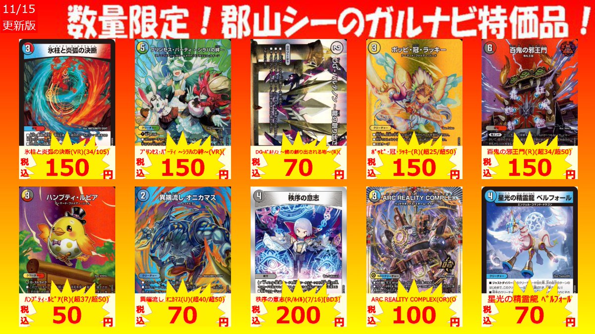 数量限定!郡山シー限定ガルナビ特価品 超次元の王家(SR)(15/105) ¥50 DARK MEMORY CONTAINER ¥70 洗打の妖精(U)(34/77) ¥100 #デュエマ #シーガル郡山 #アツアツ特価