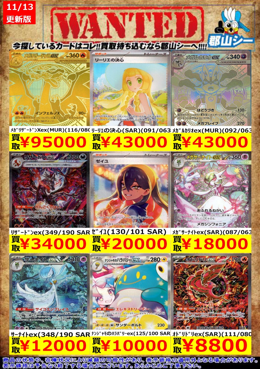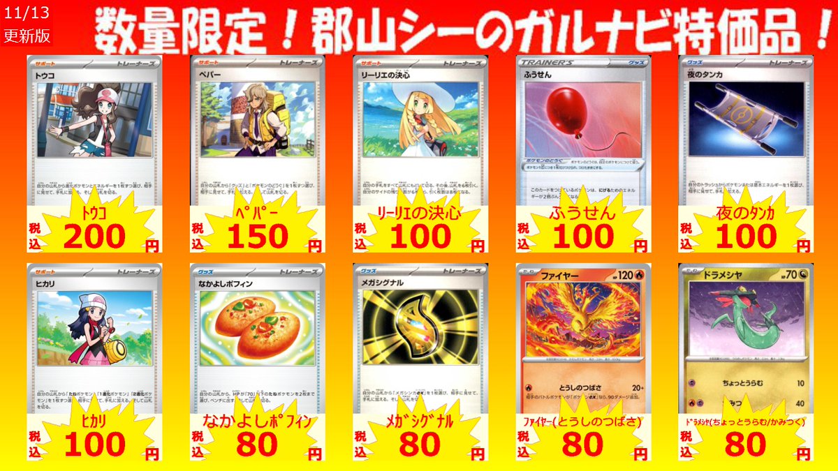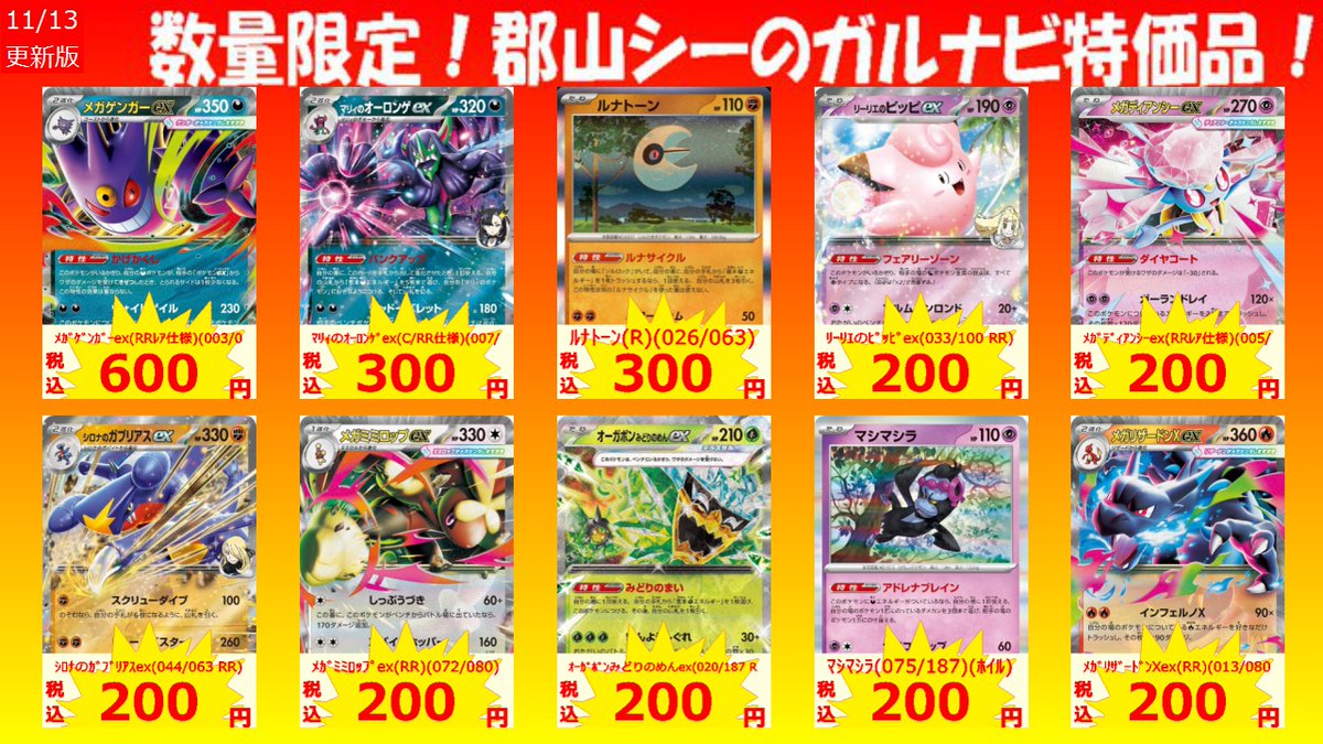 数量限定郡山シー限定ガルナビ特価品! ※買取金額ではございません※ キチキギスex(104/187 RR) ¥100 メガルカリオex(RR)(029/063) ¥100 ストリンダー(R)(057/080) ¥100