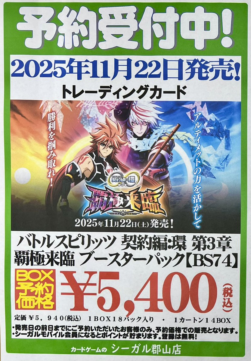 【ご予約受付中】 ✅11/22 発売 #バトルスピリッツ ブースターパック 『契約編:環 第3章 覇極来臨』 ただいま予約受付中です❗️ ご予約お待ちしております😊 #シーガル郡山店予約