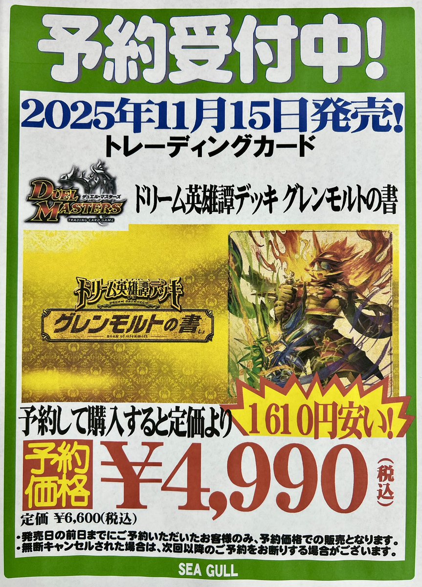【値下げ価格にてご予約受付中✨】 #デュエルマスターズ 11/15(土) 発売 ドリーム英雄譚デッキ ✅グレンモルトの書 価格がお安くなりました‼️ ご予約お待ちしております😊 ※すでにご予約のお客様もこちらの価格に変更となります🙇♂️ ご予約お待ちしております😊 #シーガル郡山店予約