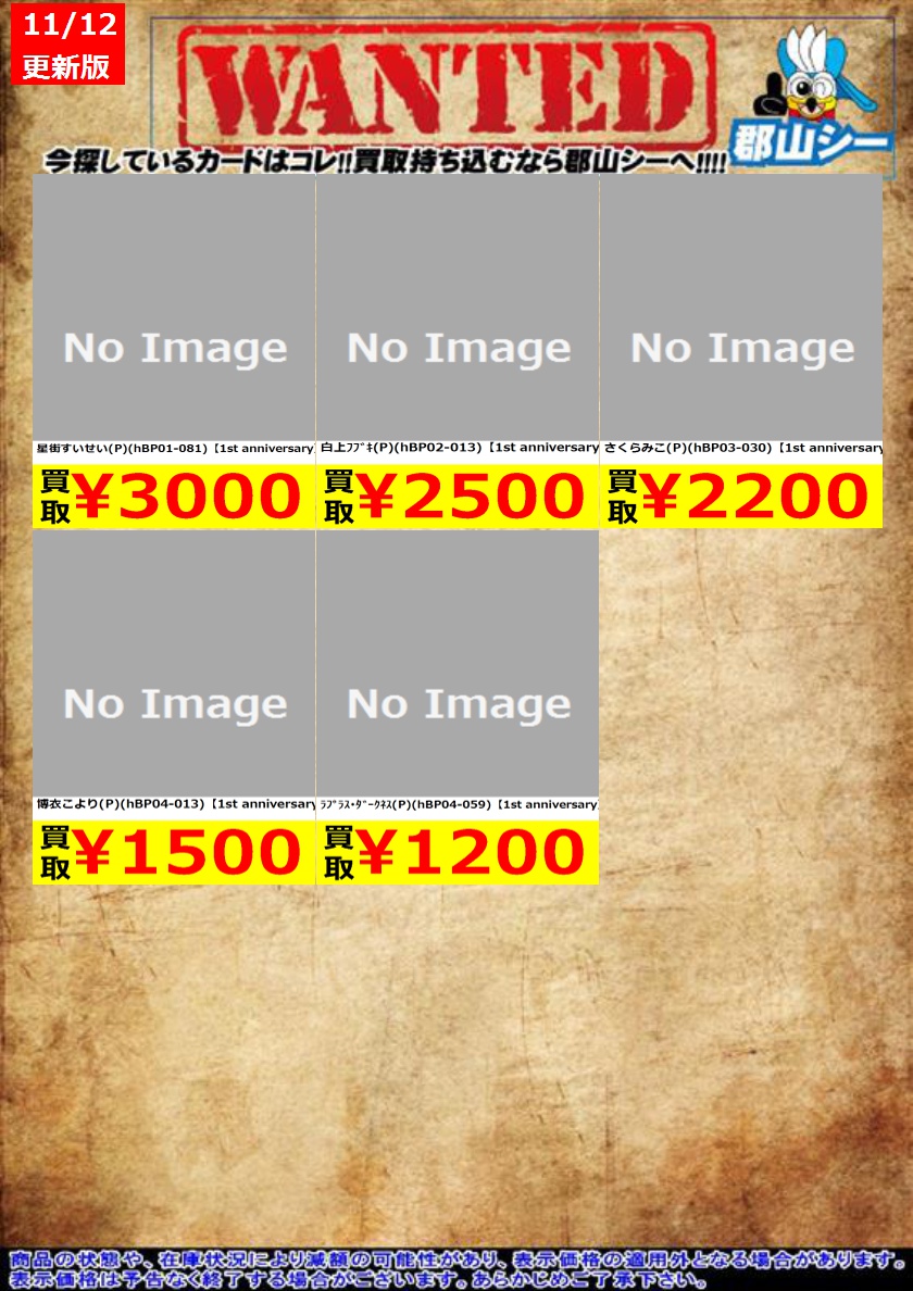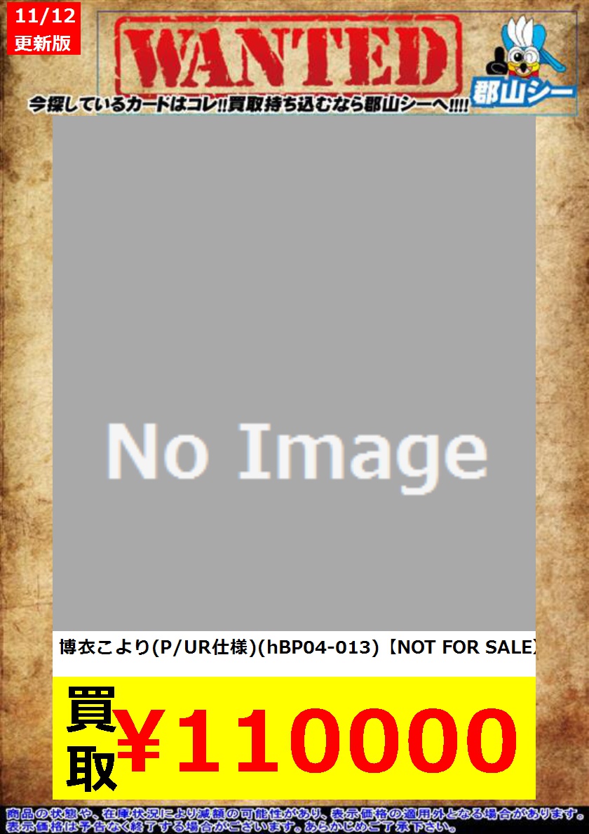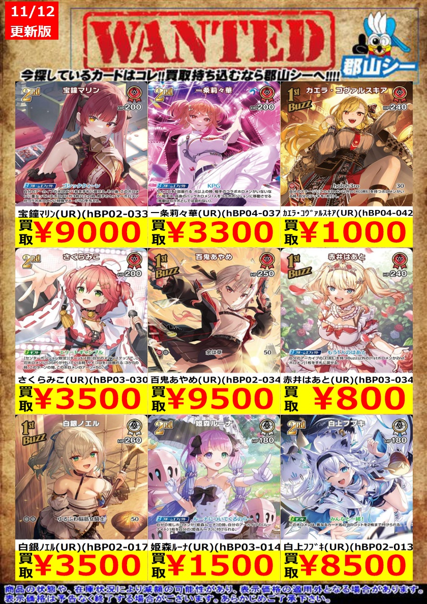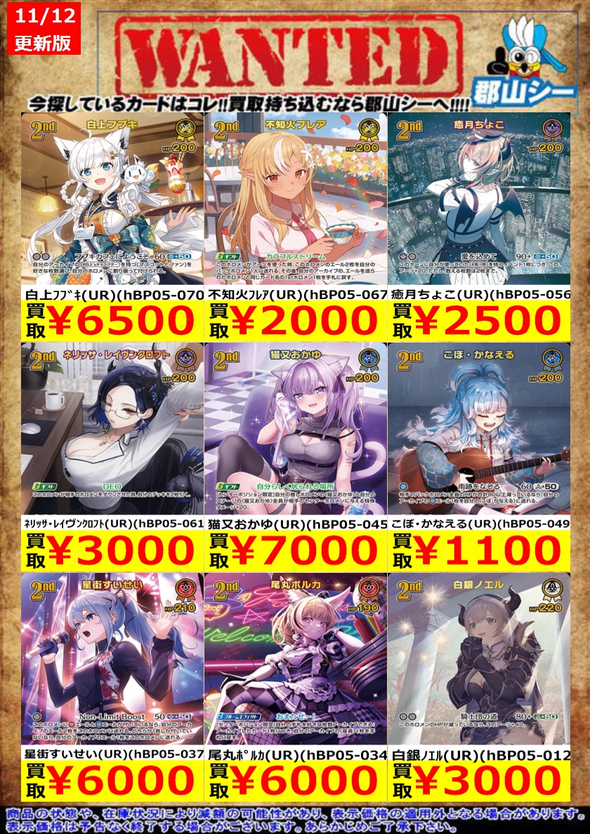 シーガル郡山店ホロライブOCGお買取り情報!! ※商品の状態や在庫状況により減額の可能性があり、表示価格の適用外となる場合がございます。 白銀ノエル(UR)(hBP02-017) ¥3,500 兎田ぺこら(UR)(hBP01-043) ¥400 獅白ぼたん(UR)(hBP03-021) ¥2,500