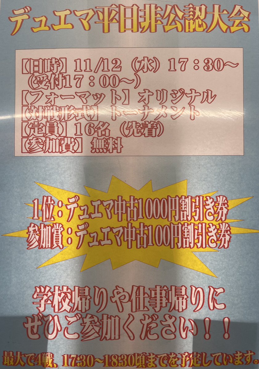 11月12日にデュエマ平日非公認大会を行います❗️ 参加費無料、優勝賞品はデュエマ中1000円割引券です✨ ご参加お待ちしております🙇♂️
