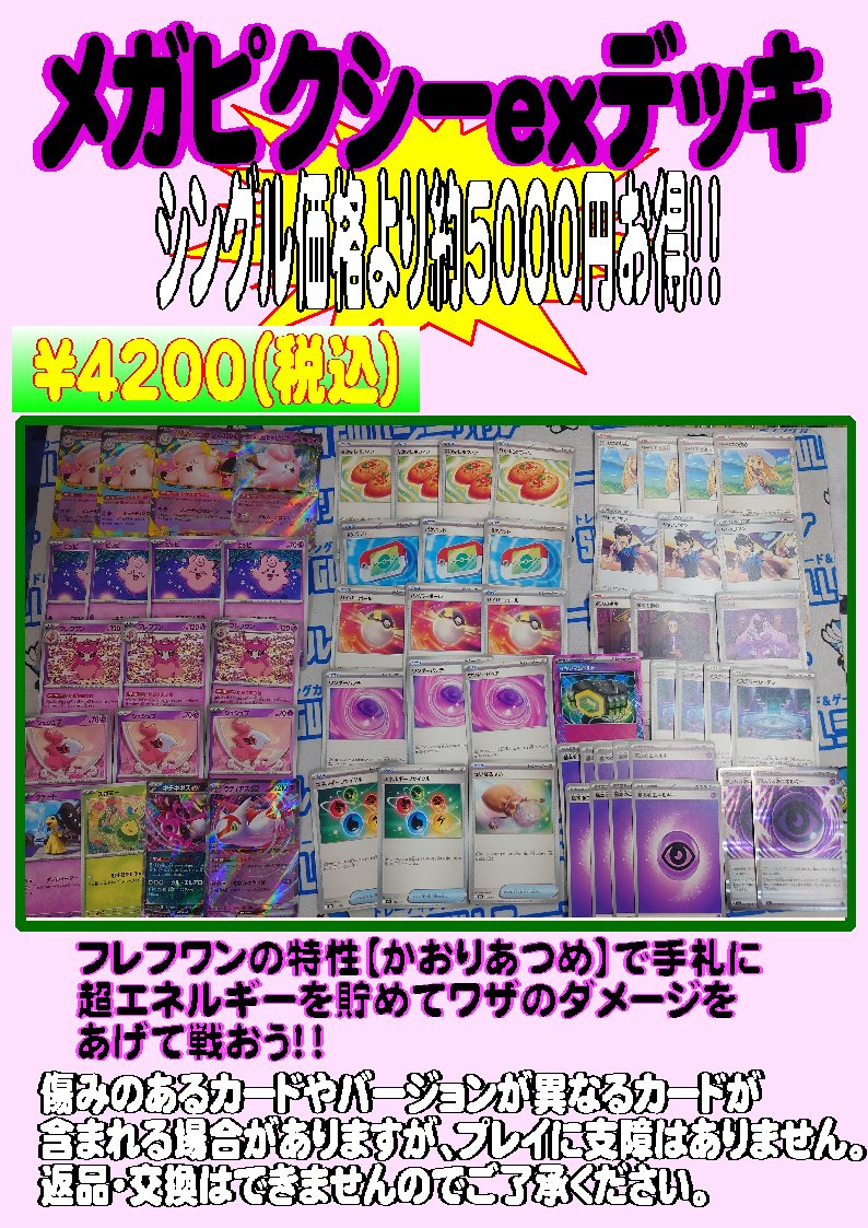 シーガル郡山店です! ポケモンカード ショーケースにて 構築済みデッキ 販売しております! 新弾 #ムニキスゼロ の超タイプポケモンが活躍する メガピクシーexデッキを作成しました。 シングルで購入するよりもお得です!! ご来店お待ちしております☺ #シーガル郡山店デッキ販売