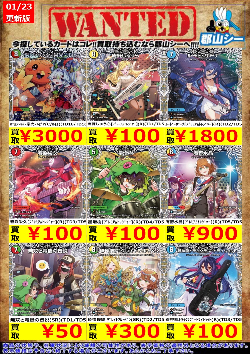 シーガル郡山店デュエマお買取り情報!! ※商品の状態や在庫状況により減額の可能性があり、表示価格の適用外となる場合がございます。 ドラゴンズ・サイン(R/ホイル)(TD2/TD3) ¥600 邪侵入(R/ホイル)(TD2/TD3) ¥100 星龍パーフェクト・アース(SR)(TD9/TD16) ¥100