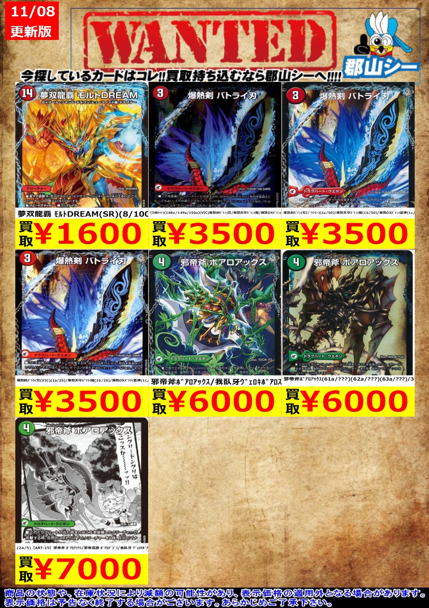 シーガル郡山店デュエマお買取り情報!! ※商品の状態や在庫状況により減額の可能性があり、表示価格の適用外となる場合がございます。 夢双龍覇 モルトDREAM(SR)(8/100) ¥1,600 爆熱剣バトライ刃(VIC)(1a/25)¥3,500 邪帝斧ボアロアックス/我臥牙ヴェロキボアロス ¥6,000